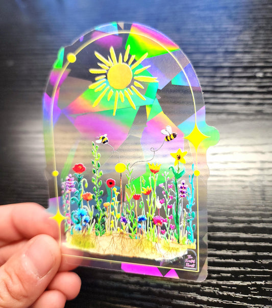 Wildflower n Bees Suncatcher Sticker - Window decal- Fractals -Watercolor Painting- Rainbow Prism Light - Shadow & Light Art