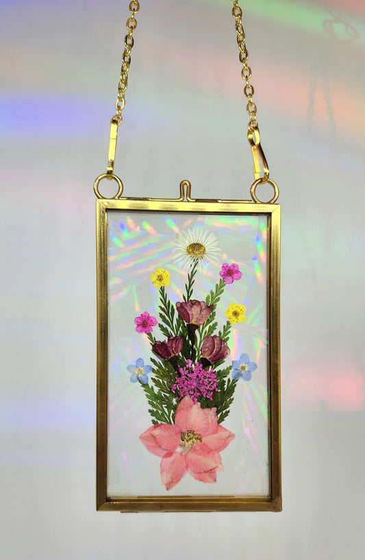 Add beauty to any space with this one of a kind pressed flower arrangement. These wild flowers have an extra unique & bright touch with light diffraction glass to cast splashing rainbows into your home! These frames are completely covered with prisms for maximum rainbow effects.